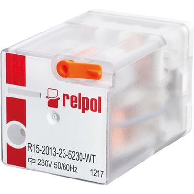 Relæ 3C/O 10A 230VAC med mekanisk indikator og testknap.
