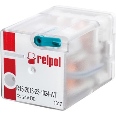 Relæ 3C/O 10A 24VDC med mekanisk indikator og testknap.