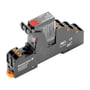 Komplet relæ med sokkel, 2 skiftekontakter (2CO), 5A mærkstrøm og 230VDC spolespænding. Med testknap og Push-In klemmer.