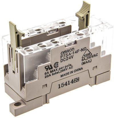 Sokkel til DIN-skinne eller overflademontering med 14 pin, skrueklemmer, LED-indikator og beregnet til G7SA 6 relæer.