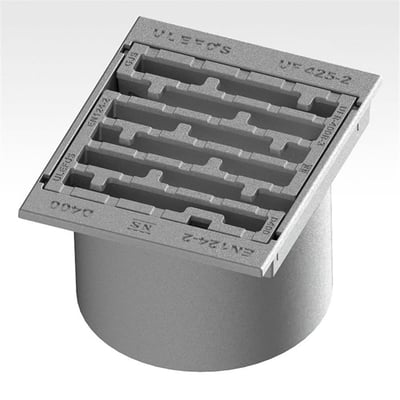 Ulefos flydende rendestenskarm med aftagelig tværvendt rist, dæmpering, 2 flanger og langt skørt. Belastning: D400. Til opføringsrør Ø425 mm. Højde: 316 mm. Sejjern.