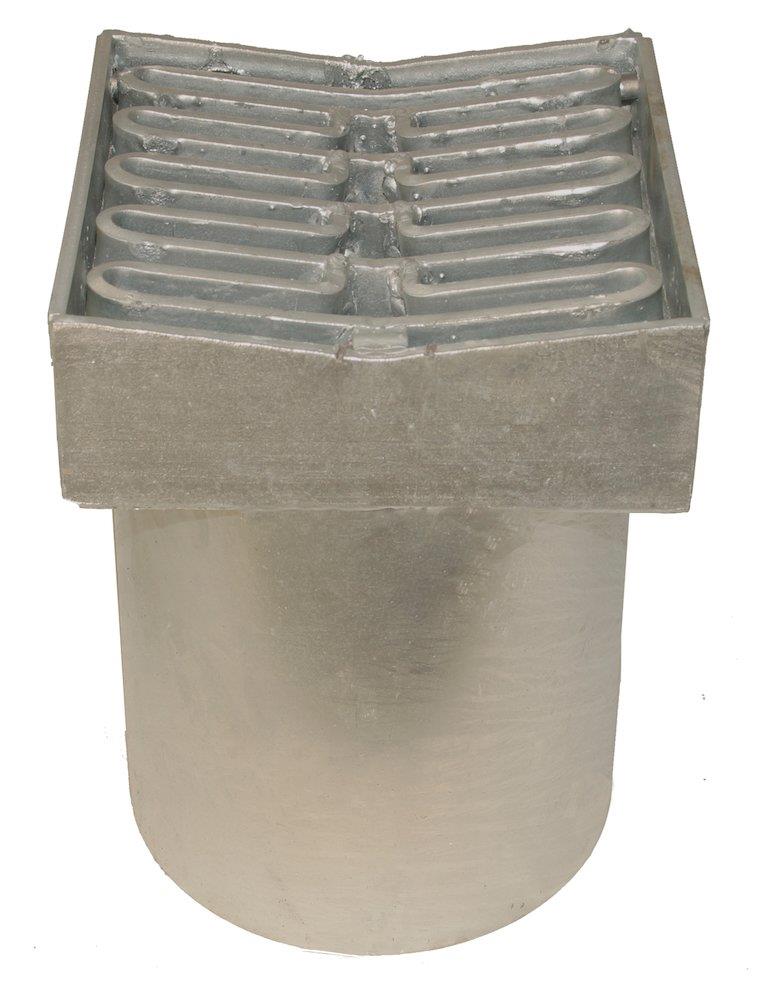 Galvaniseret rendestensrist i smedejern med skørt og nedadbuet rist til belægningssten. Belastning op til 40 ton.
