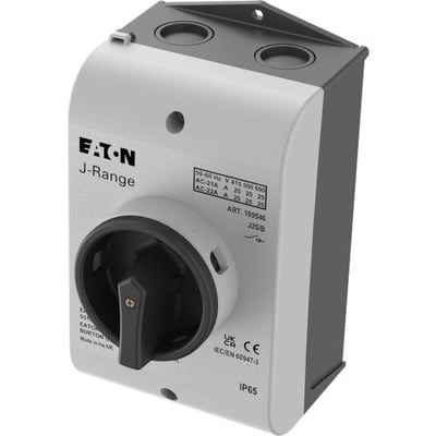 Kapslet reparationsafbryder fra Eaton, IP65, 25A, 3P, i sort-grå med sort aflåseligt håndtag.