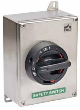 Katko reparationsafbryder med 4 poler og 25A. Denne model har en rustfri kapsling H23 og et sort håndtag.