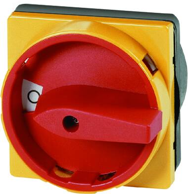 3-polet reparationsafbryder med nul og nødstopfunktion. Aflåseligt, rødt håndtag med gul baggrund. Tilbehør: hjælpekontakt, underspændings- og shuntudløser. IP65 front.