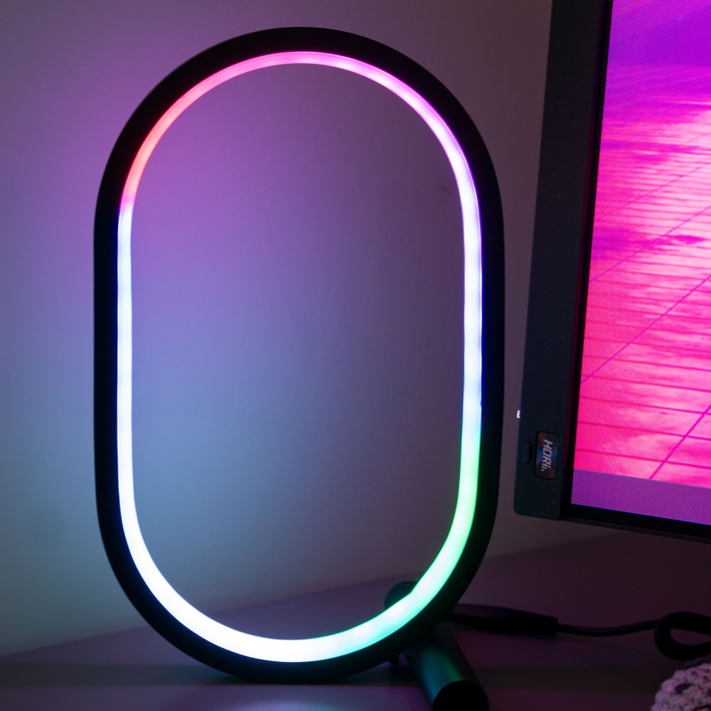 Skab stemning med denne ellipseformede RGBIC lampe. Juster farver og lysstyrke med fjernbetjeningen. Nem USB tilslutning.