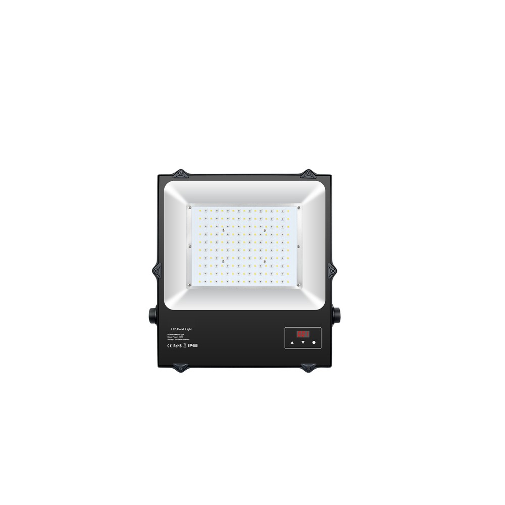 Kraftig 100W RGBW DMX projektør med IP65-klassificering. Ideel som arbejdslampe med DMX512 styring for præcis farvejustering.