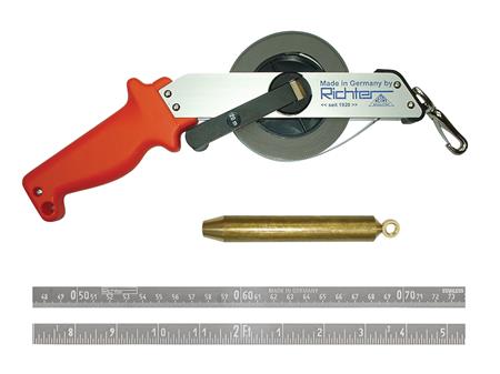 Rustfrit stålbånd fra Richter med graveret markering, karabinhage og MM/INCH-deling. Inkl. lod og SR-ramme.