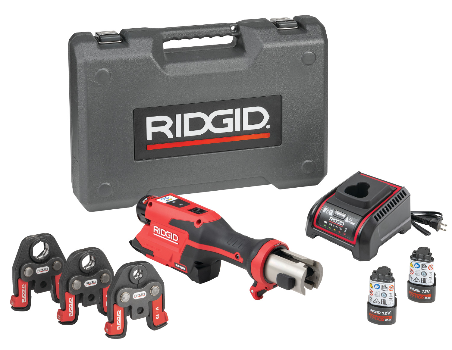 Ridgid RP251 pressmaskine med 2 x 12 V/2,5 Ah batterier, lader og V 15/22/28. Ideel til professionelle VVS-opgaver.