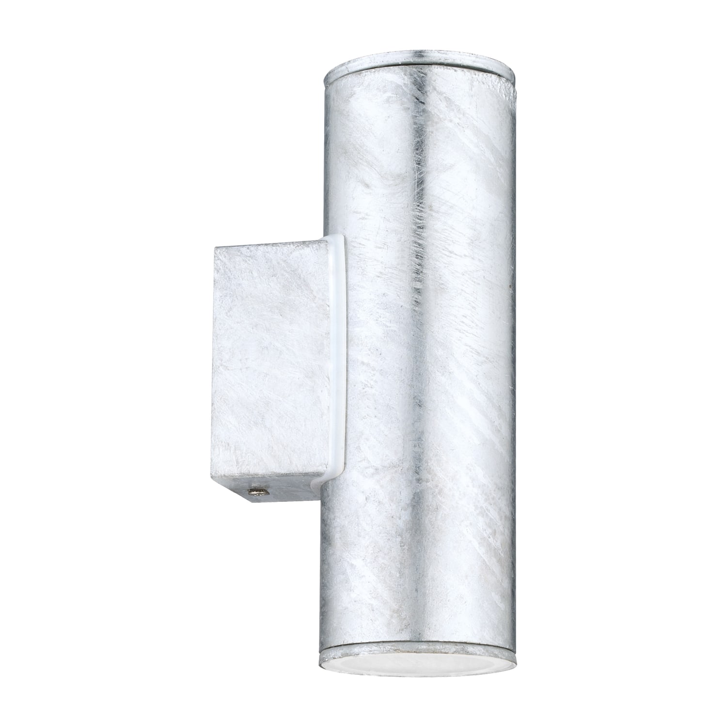 Moderne LED væglampe til udendørs brug. Fremstillet i galvaniseret stål med 2x3W GU10 LED. IP44 klassificeret. Mål: Ø 6,5cm, H: 20cm, D: 9,5cm.