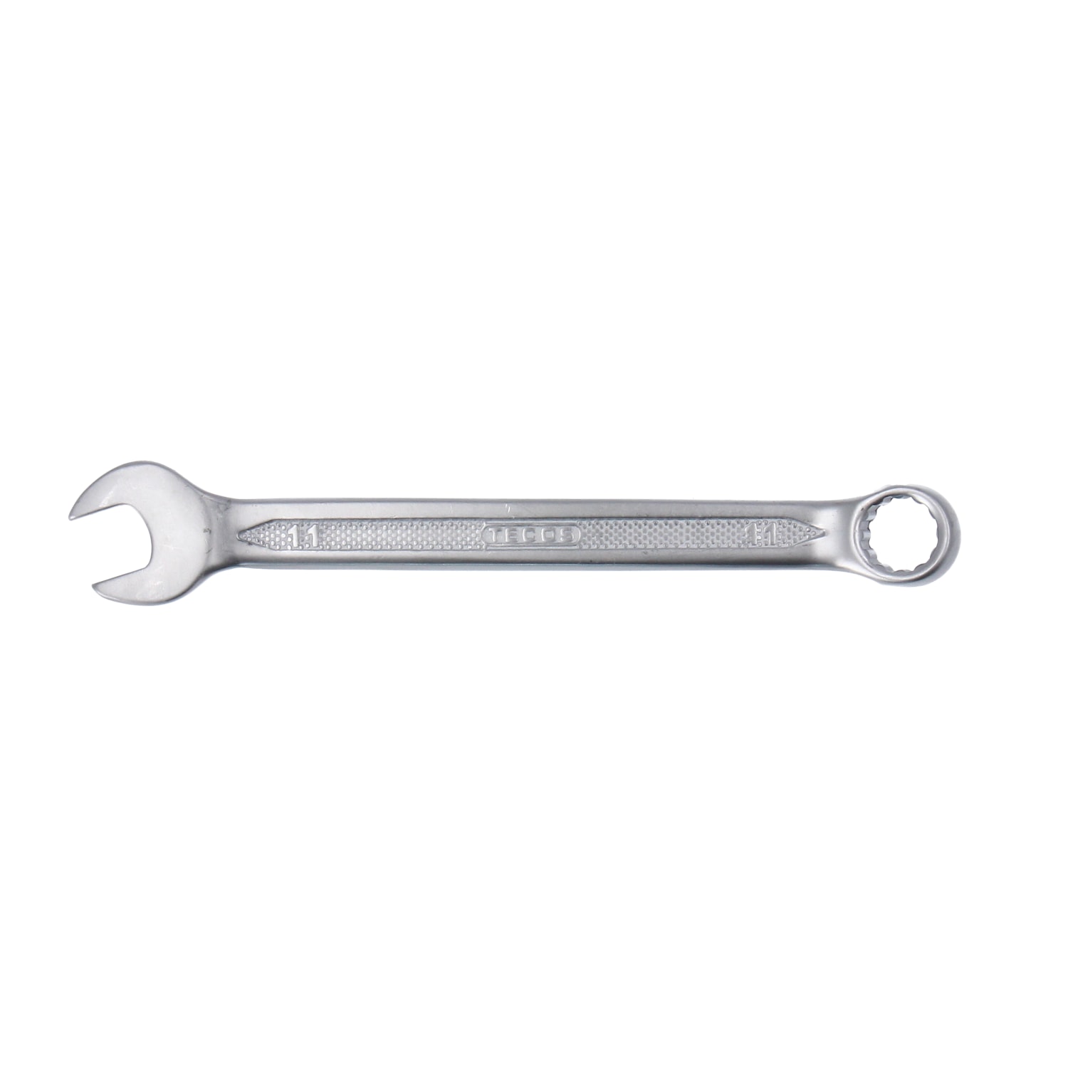 Tecos ringgaffelnøgle fremstillet i chrom vanadium stål. Med blankpoleret hoved og silkemat overflade. Ringsiden har 12 kant og 15° vinkling.