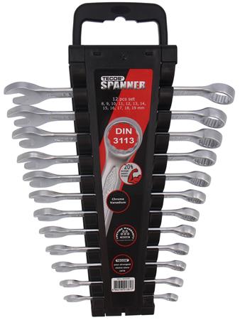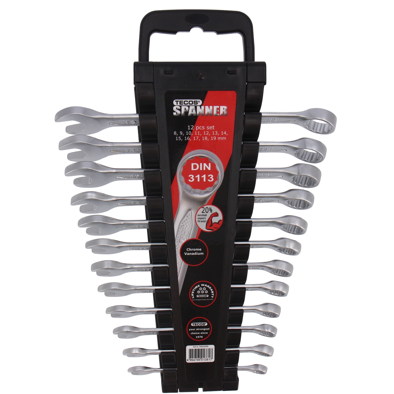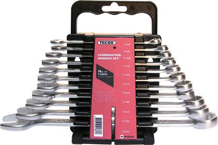 Tecos ringgaffelnøglesæt fremstillet i Chrom Vanadium stål efter DIN3113. Sættet indeholder 11 nøgler i størrelserne 8-19 mm og leveres i en praktisk plastic clips.