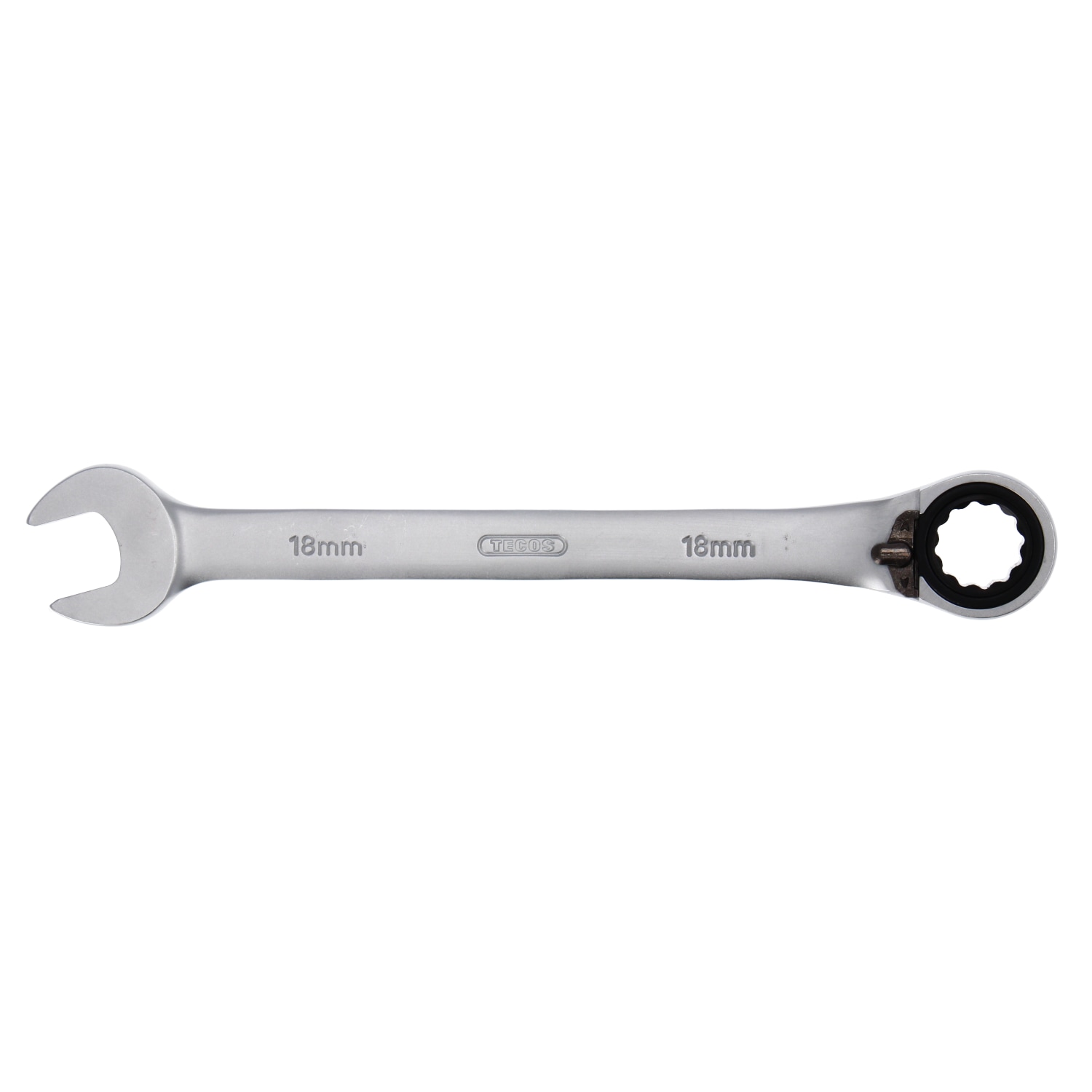 Tecos ringgaffelnøgle med omstilbar skralde. Skralder ved 5° bevægelse i begge retninger. Ringgrebet er vinklet 15°.