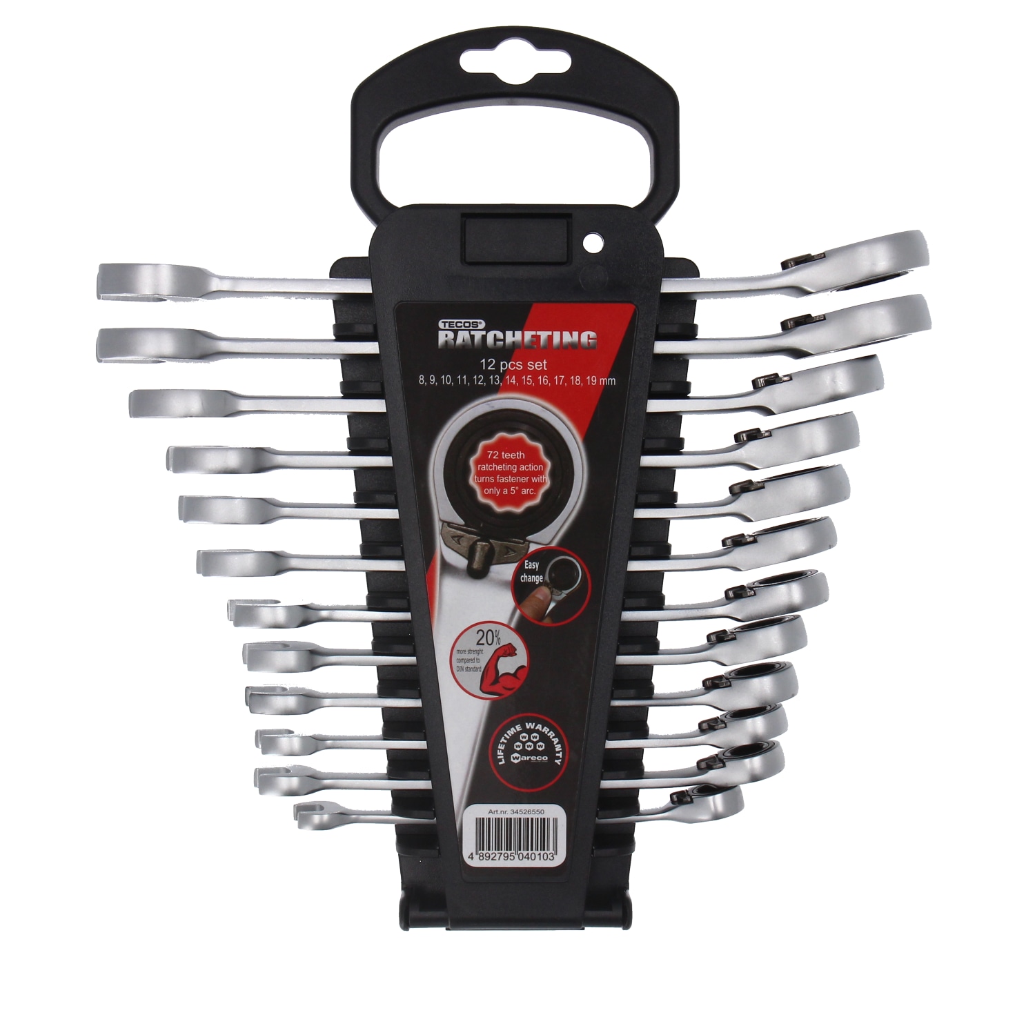 Tecos ringskraldenøglesæt med 12 dele. Indeholder omstilbar skralde med 72 tænder, der aktiveres ved 5° bevægelse. Med 12 nøgler (8-19 mm) og 4 adaptere til toppe og bits.