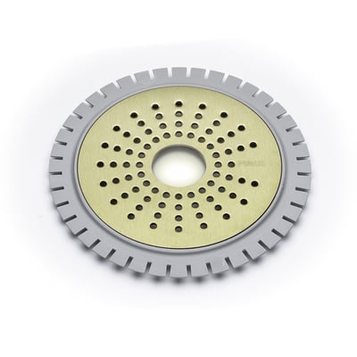 Rist til microcement Sun Ø150 i messingfarvet PVD-finish, med udskæring. Fremstillet i rustfrit stål og passer til alle Purus gulvafløb Ø150 mm.
