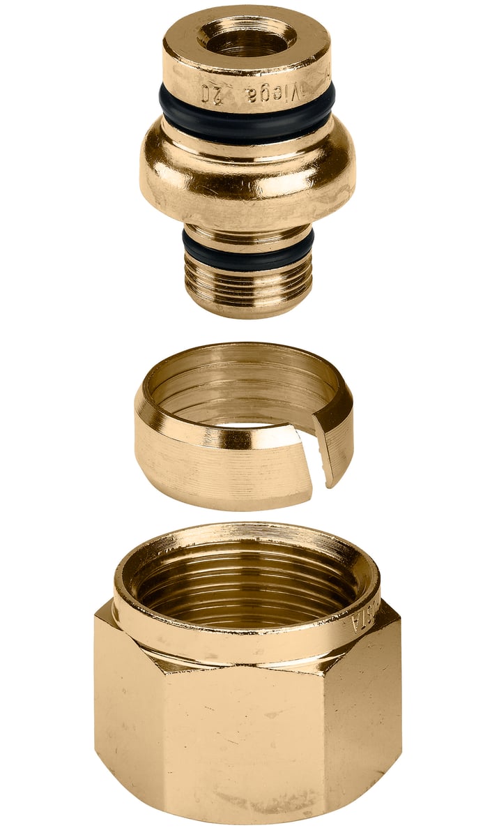 Klemringsforskruning fra Viega i rødgods. Velegnet til 15 mm PEX rør og andre rørmærker, men ikke til PE-Xc/Al/PE-Xc.