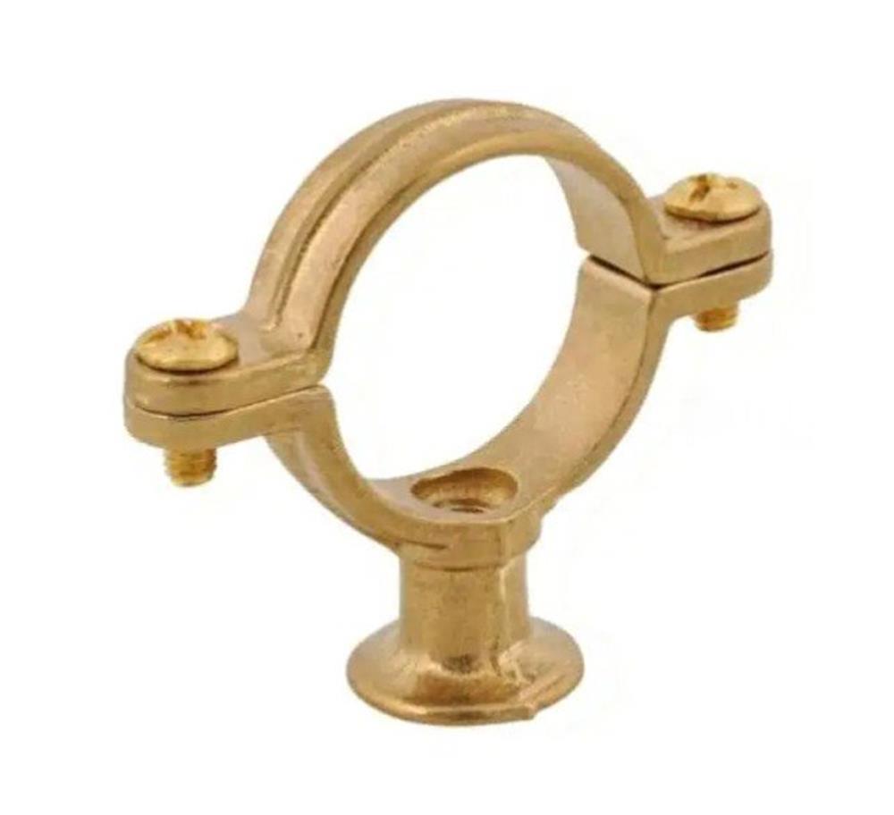 To-delt rørholder i messing med vægflange. Beregnet til fastgørelse af rør mod væg eller loft.