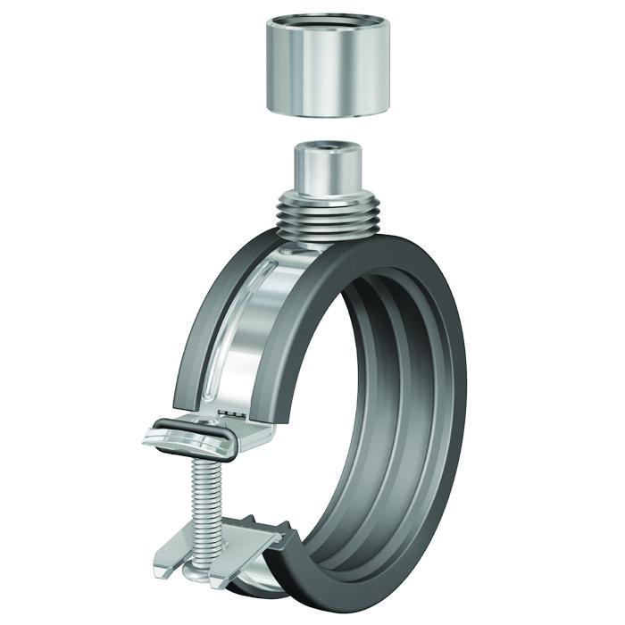 Universelle rørbøjler fra Flamco med lyddæmpende gummibånd til montering af rør på væg eller loft.