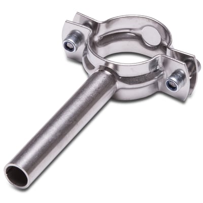 Rørholder til levnedsmiddelfittings. Lang skaft, stram model, udført i 304 stål og passer til rør med en diameter på Ø84-85.