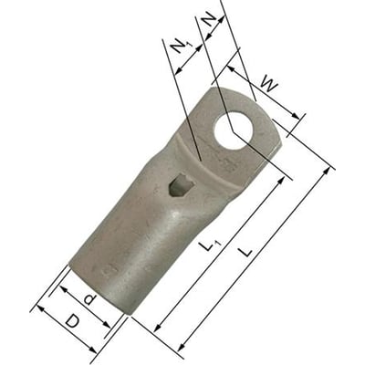 Kobber rørkabelsko med smal laske KRFN185-10, beregnet til 185mm² få- og mangetrådede Cu-ledere iht. IEC60228. Med M10 laske og inspektionshul.
