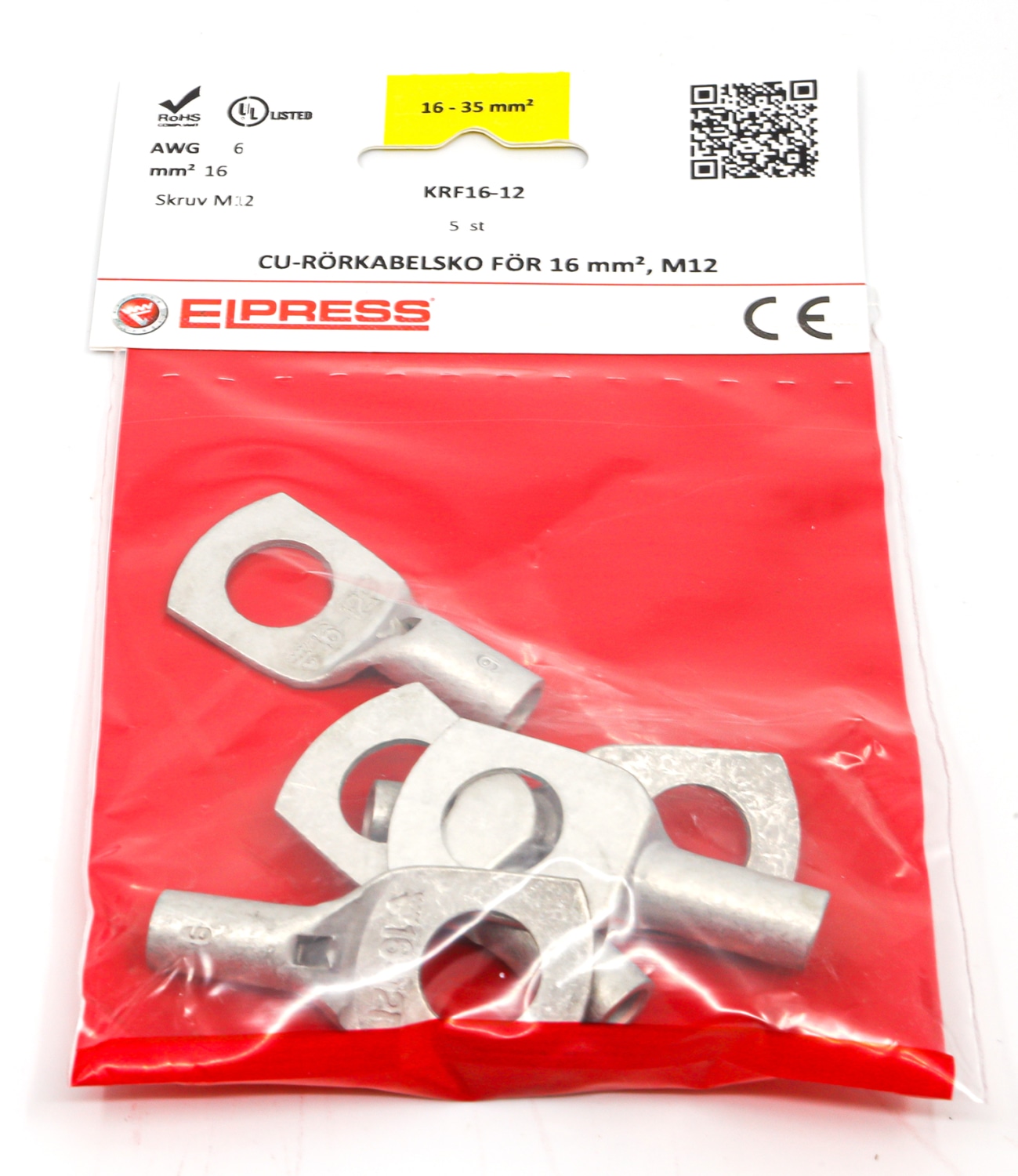 Kobber rørkabelsko KRF16-12 til sikker og effektiv forbindelse af kabler. Disse rørkabelsko er fremstillet af Cu 99,95% kobber og er fortinnede for at sikre optimal ledningsevne og holdbarhed.