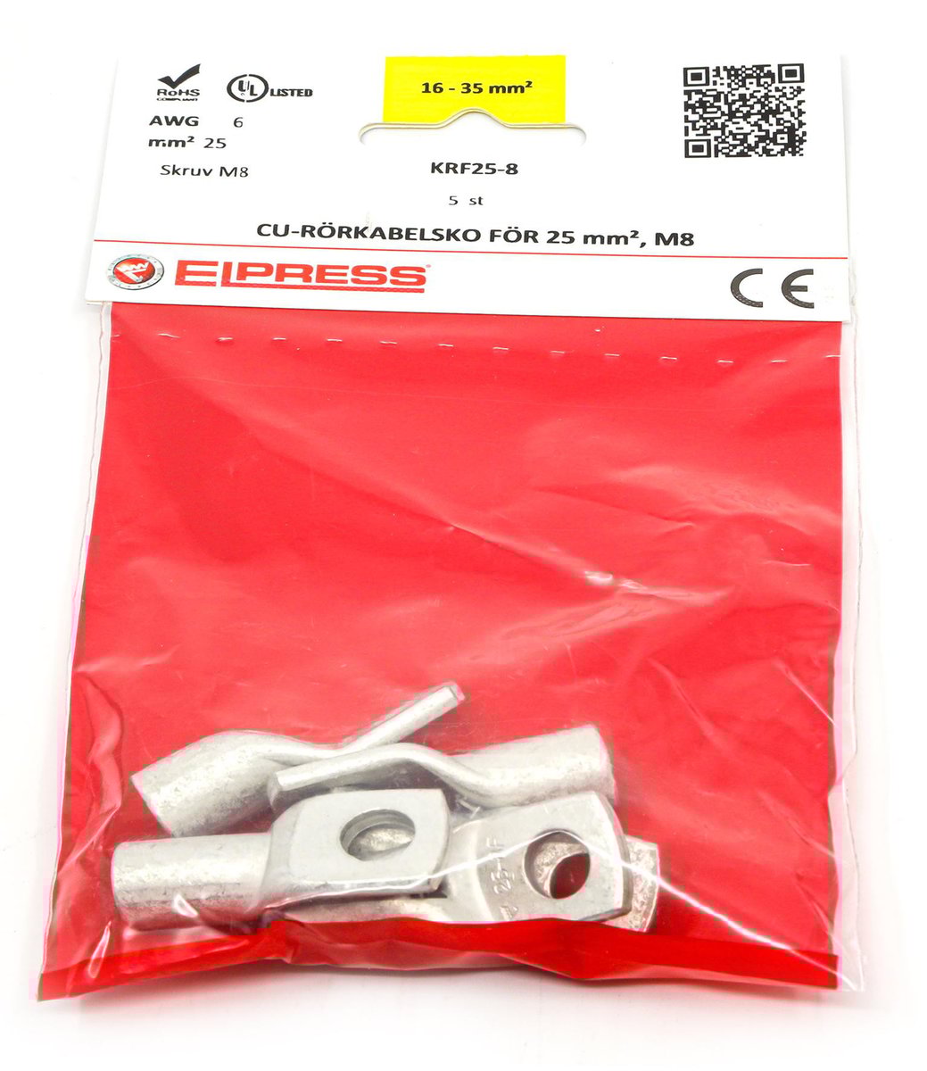 Kobber rørkabelsko KRF25-8, fortinnet Cu 99,95%. Til 25mm² Cu-ledere (klasse 2, 5+6). Laske M8. Leveres i poser á 5 stk.