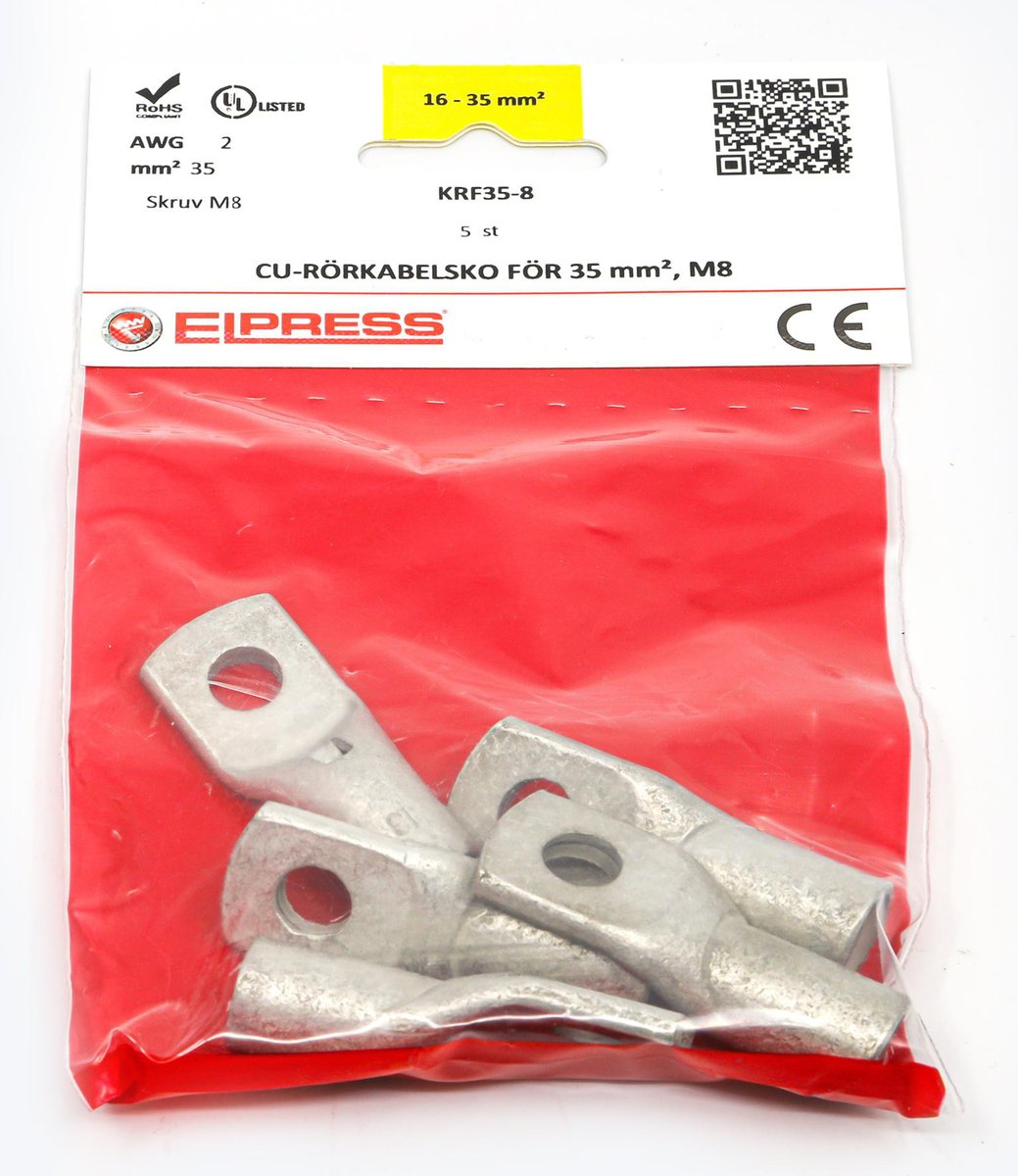 Kobber rørkabelsko KRF35-8, lavet af 99,95% fortinnet kobber. Til 35mm² Cu-ledere (klasse 2, 5+6). Laske M8, med inspektionshul.