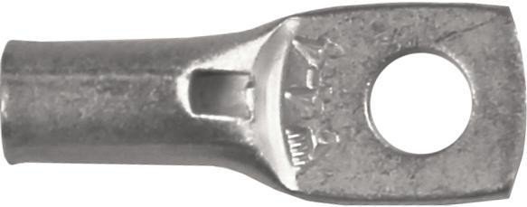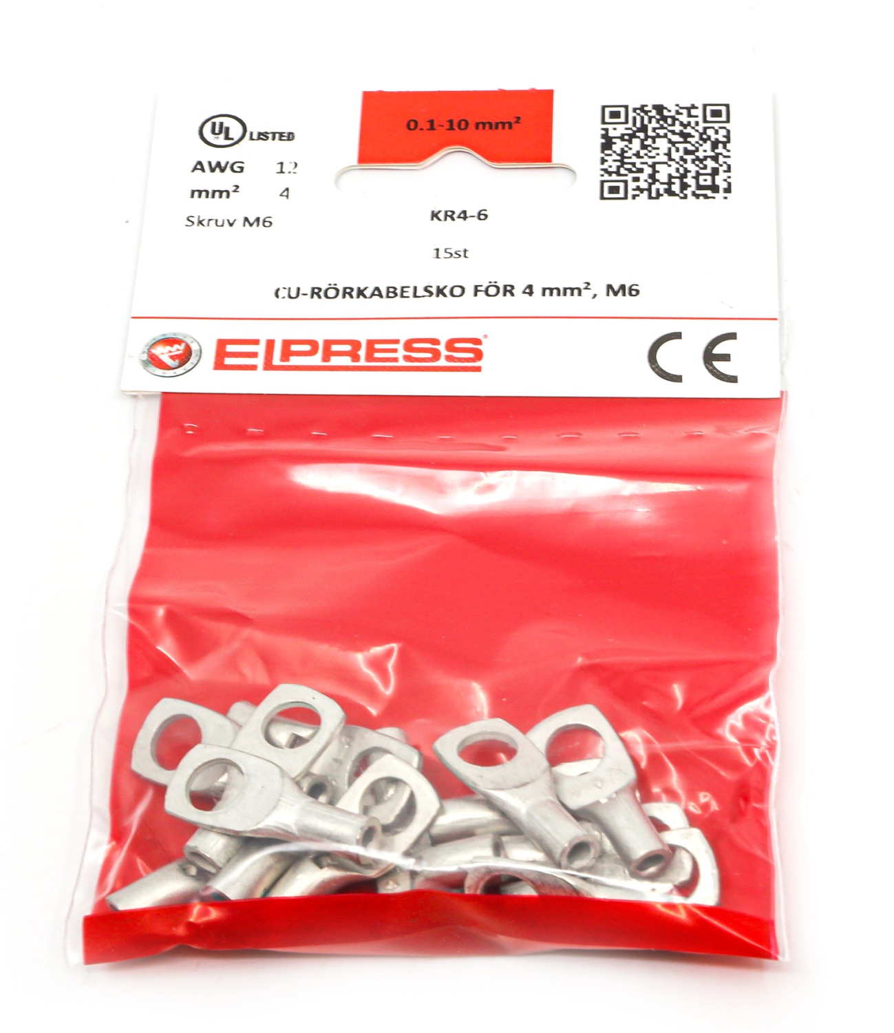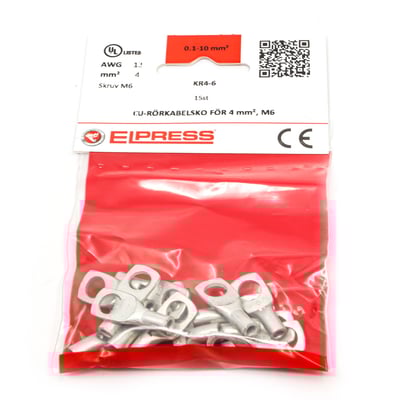 Kobber rørkabelsko KR4-6 til 4mm² få- og mangetrådede Cu-ledere. Materiale: Cu 99,95%, fortinnet. Laske: M6. Med inspektionshul. Sælges i poser á 15 stk.