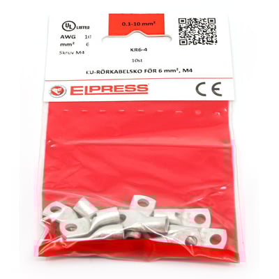 Denne rørkabelsko er fremstillet af fortinnet kobber (Cu 99,95%) og leveres i poser á 10 stk. Den er designet til brug med 6 mm² fåtrådige (klasse 2) og mangetrådige (klasse 5) Cu-ledere i henhold til IEC60228.