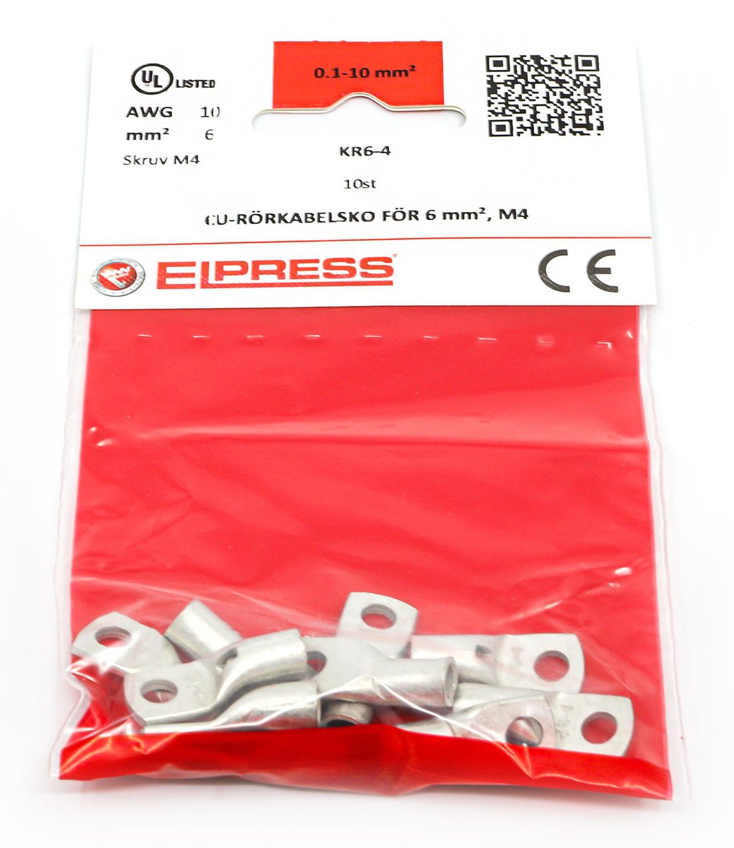 Kobber rørkabelsko KR6-4 i fortinnet Cu 99,95%. Til 6 mm² ledere (klasse 2 og 5). Inkl. inspektionshul.