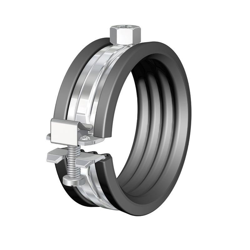 Universelle rørbøjler fra Flamco med lyddæmpende gummibånd til sikker og støjsvag montering af rør på væg eller loft. Størrelse: 133-141 mm.