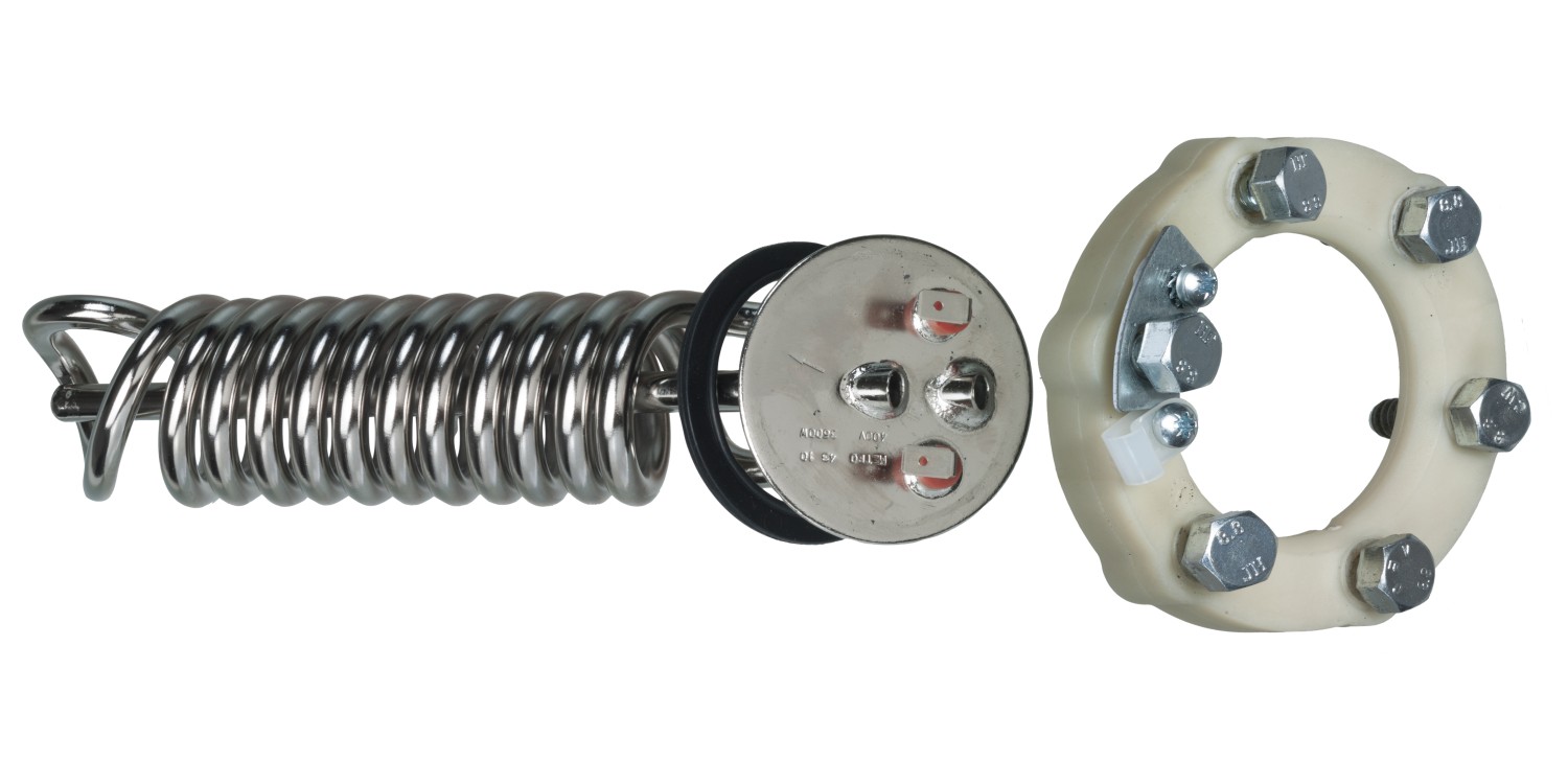 Metro Therm rørvarmelegeme, vinklet og inkl. pakning. Tilgængelig i 3,6 kW / 400 V eller 1,2 kW / 230 V. Passer til el-vandvarmere type 905, 906, 907 og 910.