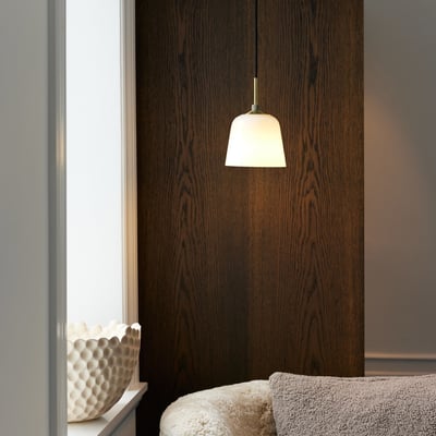 Elegant Room 49 pendel med opalglas og antik messing finish. Perfekt til indendørs brug.
