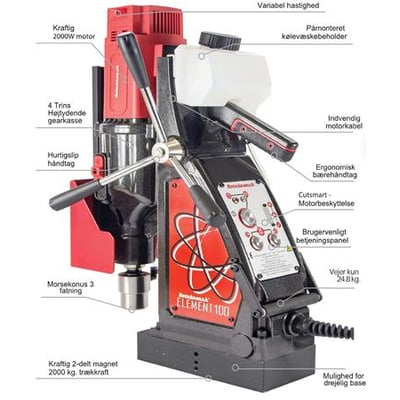 Rotabroach element 100 er den største magnetboremaskine fra Rotabroach, designet til at håndtere store diametre og dybder. Maskinen er ideel til boring op til 100mm i diameter med en maksimal boredybde på 100mm. Element 100 er udstyret med højre-venstreløb, hvilket muliggør gevindskæring.