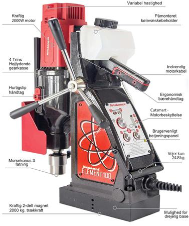Element 100 leveres som standard med en fast magnetbase, men er også tilgængelig med en drejelig base. Serien anvender et unikt dobbelt motorbeskyttelsessystem, der forlænger maskinens levetid og forebygger uønsket slid.