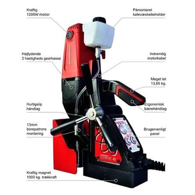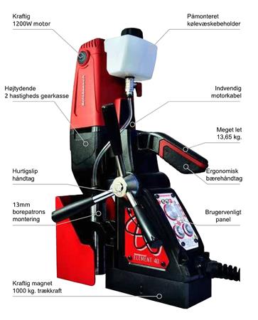 Magnetboremaskinen Element 40 er udstyret med en kraftig 2-trins mekanisk gearkasse, der sikrer effektiv drift selv under de mest krævende forhold. Dens kompakte størrelse gør den ideel til brug i trange eller vanskelige arbejdsmiljøer, mens den stadig kan håndtere boreopgaver op til 40 mm i diameter og 50 mm i dybde.