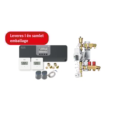 Komplet gulvvarmepakke med ShuntUnit, kontrolenhed, rumtermostater og termomotorer.