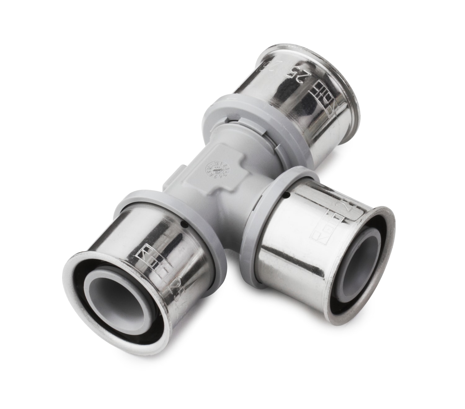 PressCheck T-stykke i korrosionsbestandig PPSU med prestilslutning. Disse fittings er designet til brug sammen med Alu-LaserPlus rør.