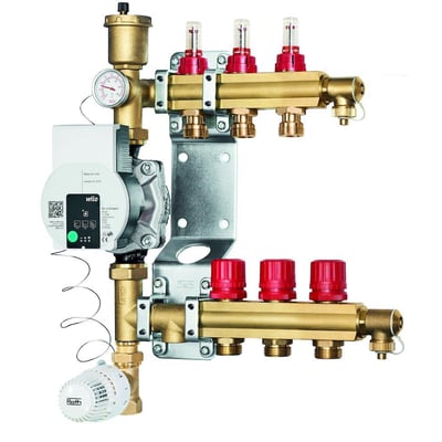 Komplet shunt med pumpe, fordelerrør med flowmåler, monteringsbeslag, udluftning og aftap.