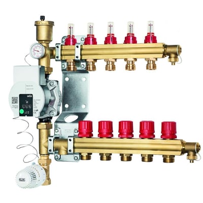 Komplet shunt med pumpe, fordelerrør med flowmåler, monteringsbeslag, udluftning og aftap.