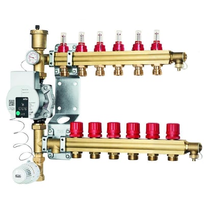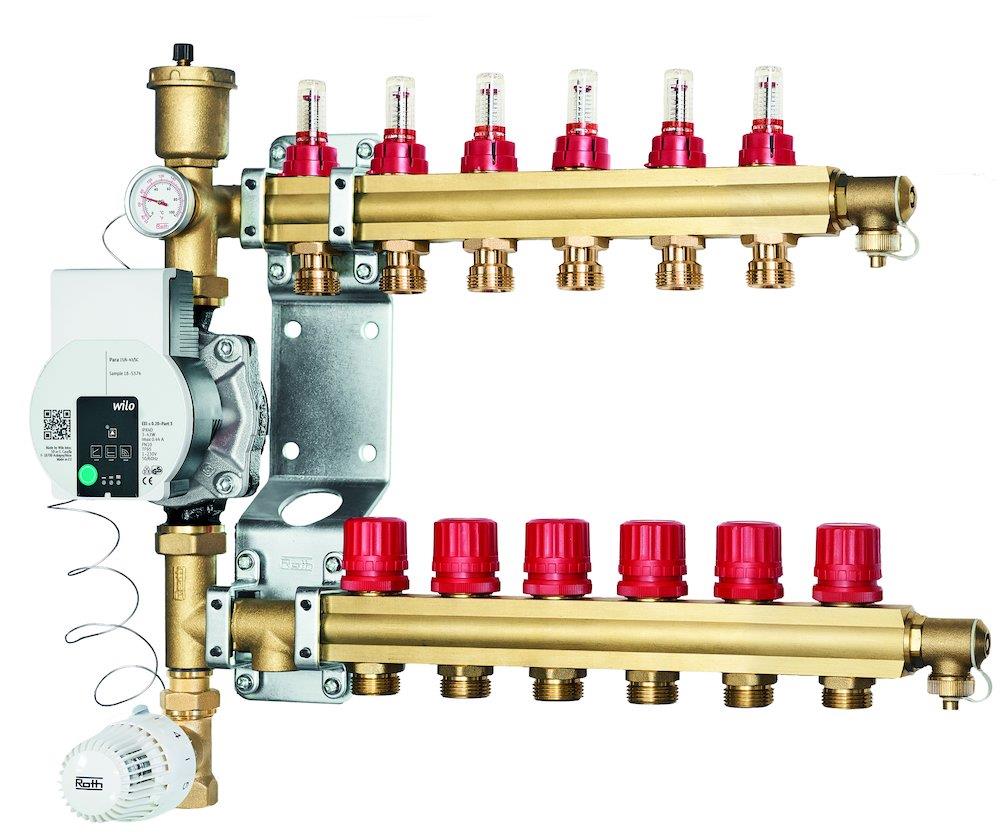 Roth ShuntUnit-6 med flowmåler leveres med præmonterede fordelerrør, pumpe, monteringsbeslag og følerelement med lås for min/max fremløbstemperatur.