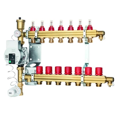Komplet shunt med pumpe, fordelerrør med flowmåler, monteringsbeslag, udluftning og aftap.