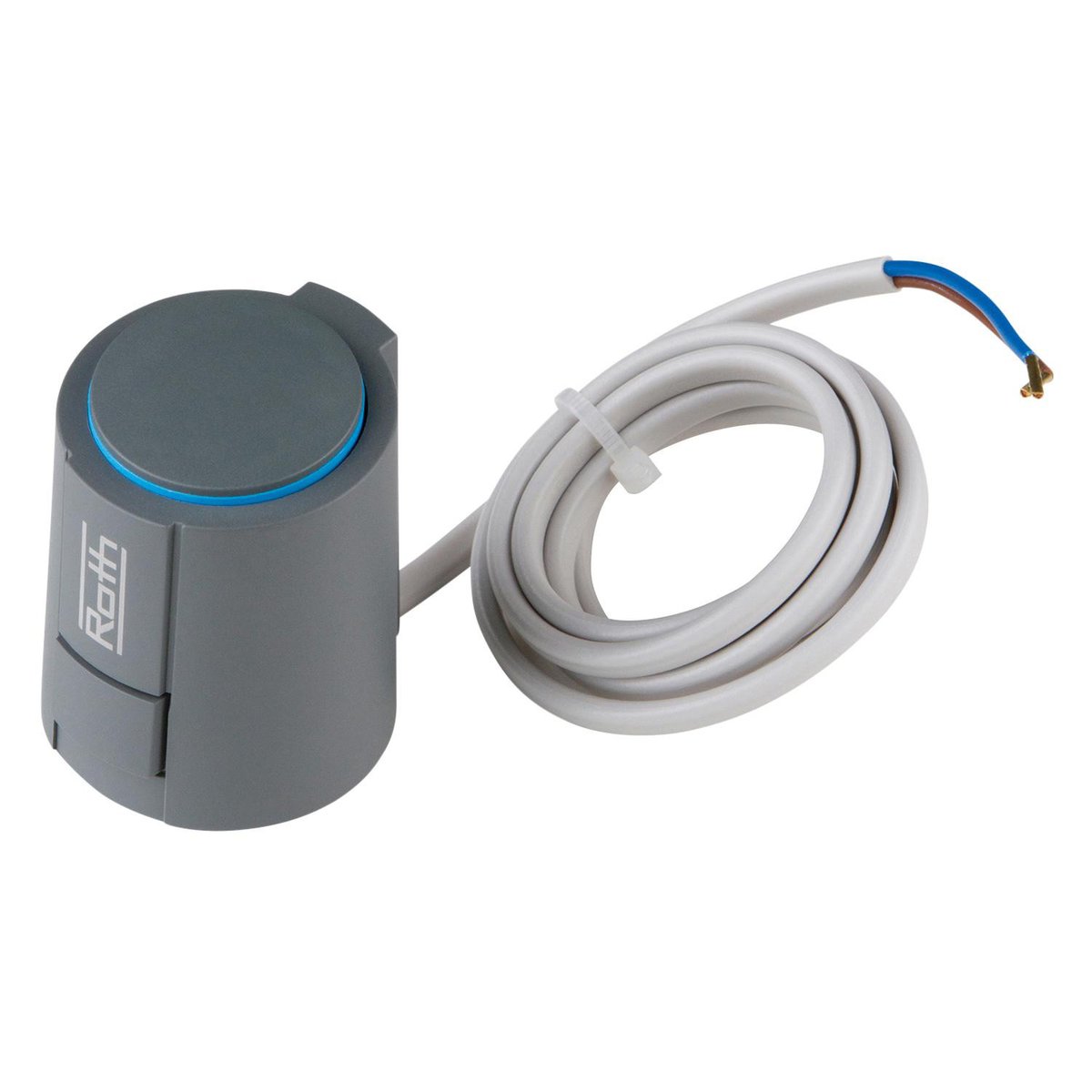 Roth termomotor til regulering af varme- og køleanlæg. Sikrer stabil regulering af effekten til varme-/kølegivere. 230V, NC (normalt lukket), 1W.