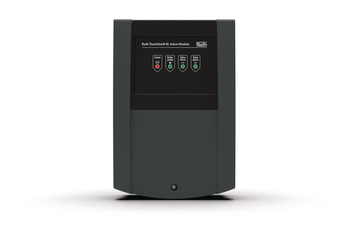 Roth Touchline SL ventilmodulet er en trådløs løsning designet til præcis styring af motorventiler baseret på behovsstyring. Modulet måler 180x100x100 mm.