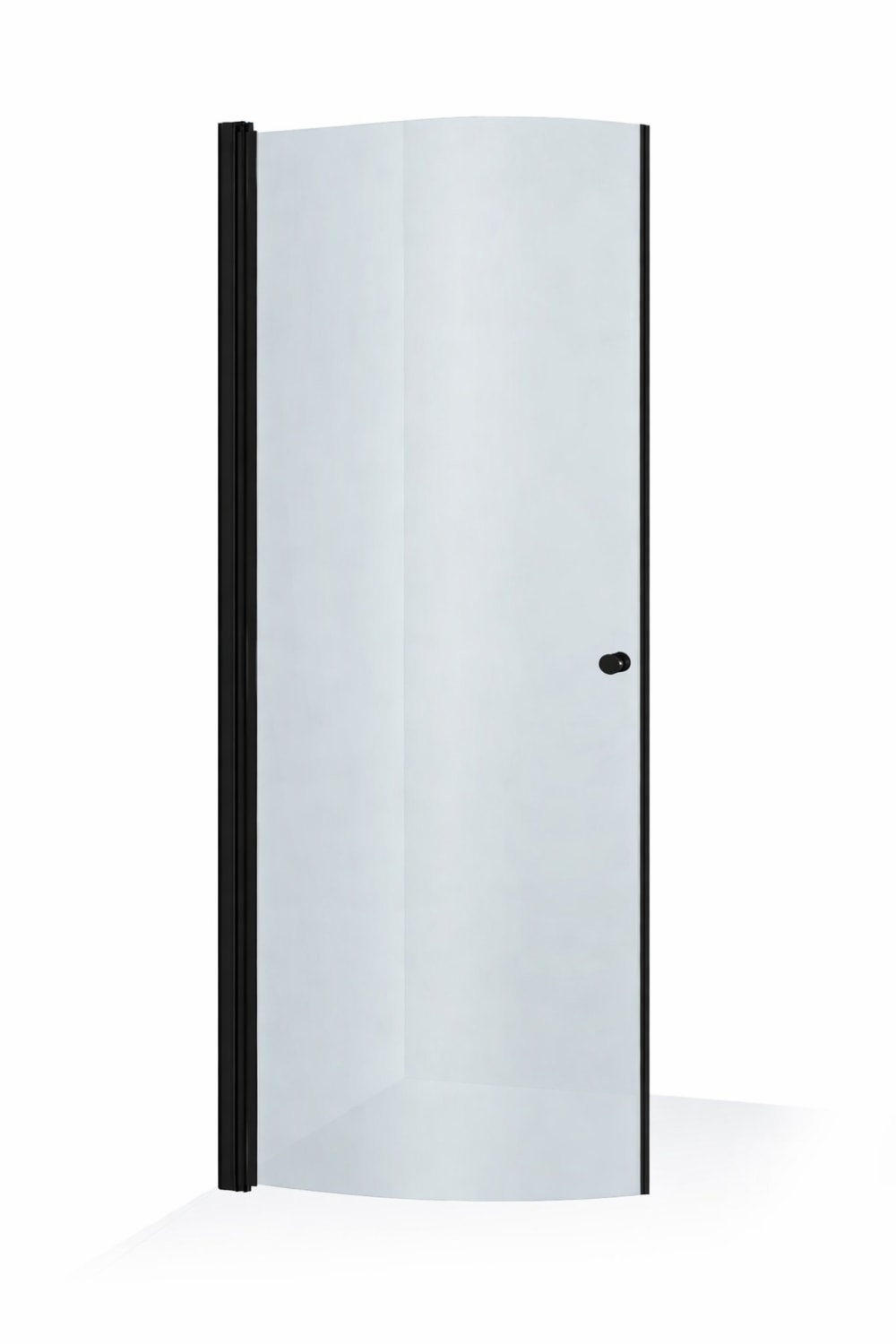 Enkelt svingdør til badeværelset med klart glas og sorte profiler. Mål: 90x190 cm. Vendbar montering.