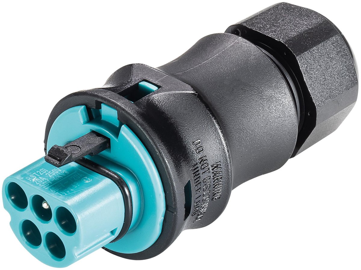 RST20I5 5-polet stik med skrue, 250V/20A, han, 0,75-4mm2, Ø=6-10mm, IP68, turkis.