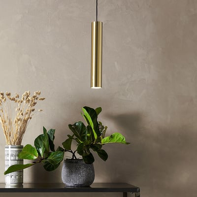 Elegant pendel i børstet messing finish. Ideel til indendørs brug. Kræver 1 lyskilde (medfølger ikke).