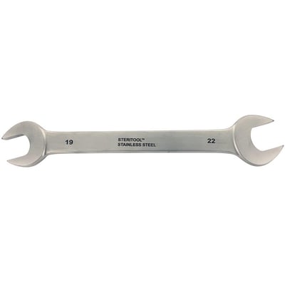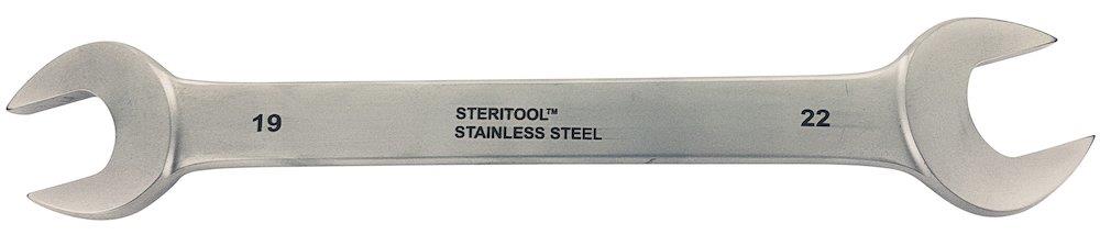 Dobbelt gaffelnøgle i rustfrit stål (400 SS serien). Vinklet 15° og hærdet til 48 HRC. Længde: 244 mm.