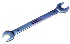 Dobbelt gaffelnøgle i rustfrit stål, vinklet 15° og hærdet til 48 HRC. Længde: 123 mm.