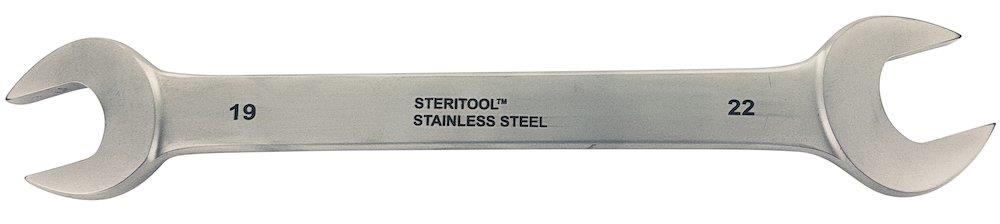 Dobbelt gaffelnøgle i rustfrit stål (400 SS serien). Vinklet 15° og hærdet til 48 HRC. Længde: 133 mm.